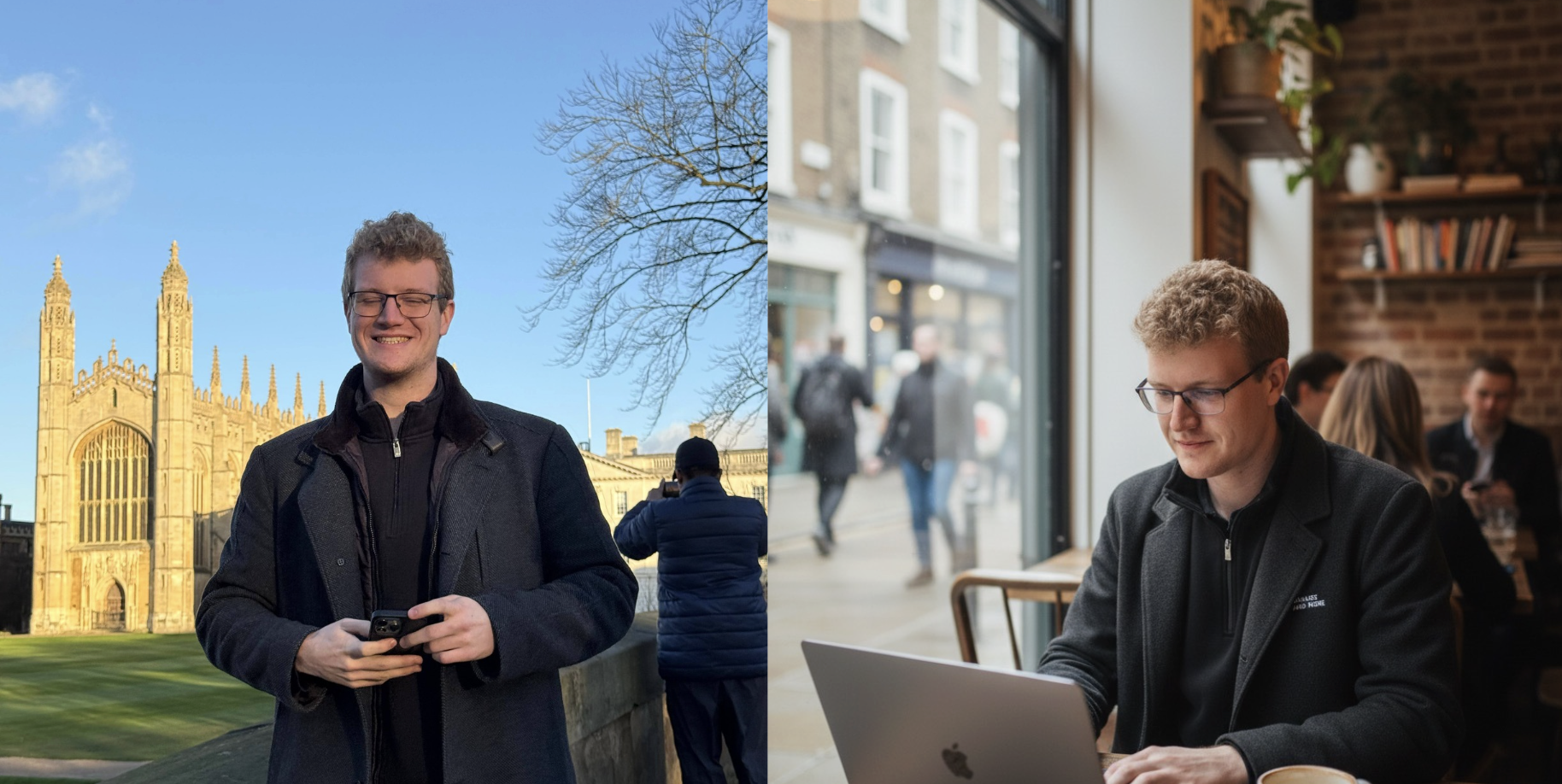 and the prompt "The man walks into a coffee shop, orders and sits down". Here's the result: